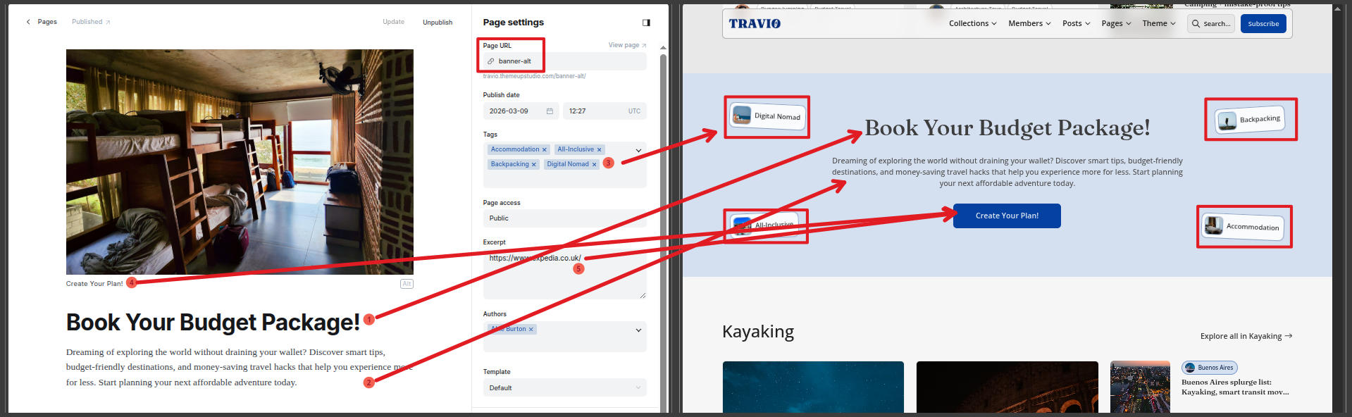 3. Theme settings with correct slug lists for `destinations` and `experiences`.